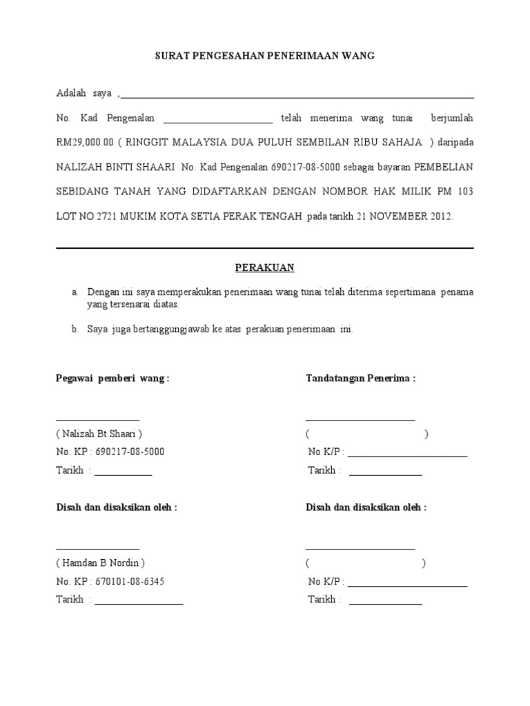 Contoh Surat Rasmi Penerimaan Wang Tunai